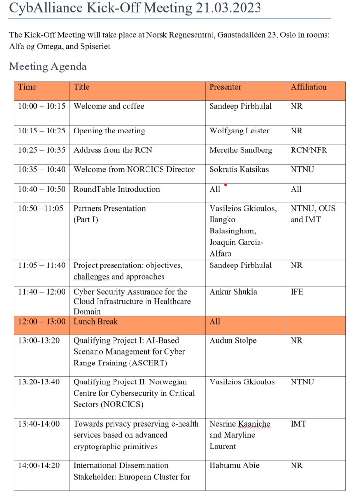 Norweigien Computing Center hosted CybAlliance (International Alliance for Strengthening Cybersecurity and Privacy in Healthcare) Project Kick-off meeting on 21st March 2023.